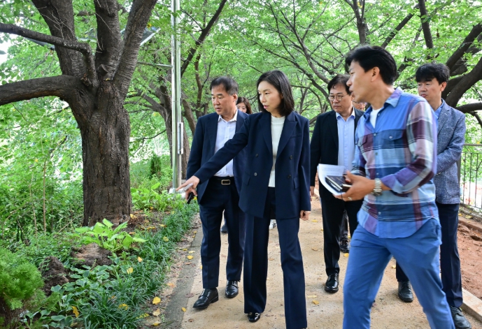 최호정 서울특별시의회 의장은 26일 안양천 생태연못 일대를 방문해 수목 등 식재된 조경 상태를 살피고 관계자들과 조경 유지관리 개선방안을 모색했다. 현장에는 서울시와 영등포구 조경 관련 공무원, 조…