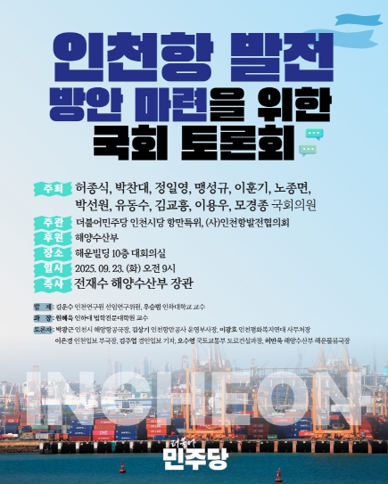 인천 지역 정치권과 항만업계, 시민단체, 정부가 인천항의 발전 방안을 논의하기 위해 한자리에 모인다.더불어민주당 허종식(인천 동구미추홀구갑) 국회의원은 9월 23일 오전 9시 여의도 해운빌딩 10층 대회…