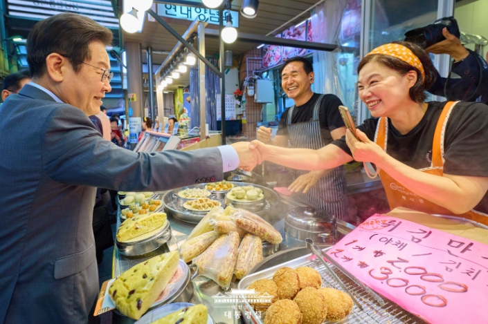 이재명 대통령은 판교에서 진행된 청년 스타트업 대표들과의 만남 후 성남시 태평동에 있는 현대시장을 약 30분가량 깜짝 방문했다.현대시장은 이재명 대통령이 성남시장으로 재직하던 시절, 상권 활성화 사…