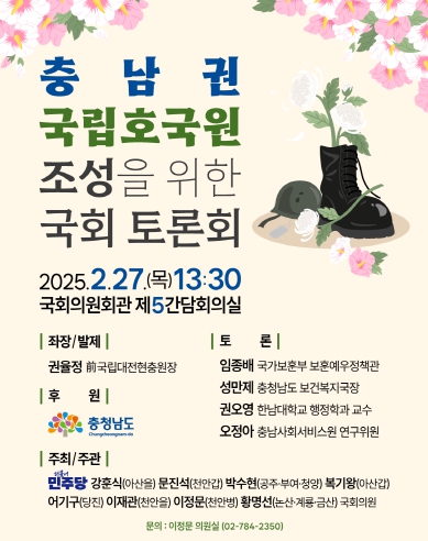 이정문 의원(민주,천안 병)을 비롯한 충남권 민주당 국회의원이 공동 주최하는 ‘충남권 국립호국원 조성을 위한 국회 토론회’가 2월 27일 목요일 오후 1시 30…