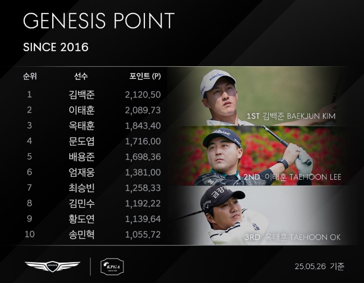 김백준(24.team속초아이)이 6개 대회 연속 제네시스 포인트 1위를 지켰다.김백준은 개막전 ‘제20회 DB손해보험 프로미 오픈’ 우승으로 제네시스 포인트 1위에 등극한 이후 ‘2025 우리금융 챔피언십’, ‘…