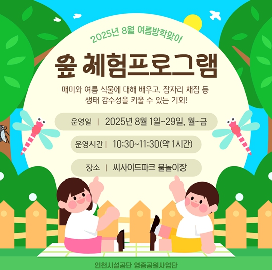 인천시설공단(이사장 김재보) 영종공원사업단은 씨사이드파크 물놀이장에서 ‘여름방학 맞이 특별 숲 체험 프로그램’을 내달 1일부터 29일까지 주말 및 공휴일 제외한 평일에 운영한다. 숲 해설가와 보조 …