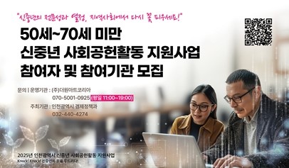 인천광역시는 50~60대 미취업 시민과 비영리기관을 대상으로 ‘2025년 신중년 사회공헌활동 지원사업’의 참여자와 참여기관을 이달 28일까지 모집한다고 밝혔다.이 사업은 경험과 전문성을 갖춘 신중년을 …