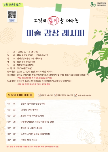 서울 강서구는 구민들에게 다양한 문화 향유의 기회를 제공하기 위해 겸재정선미술관과 허준박물관에서 특별한 문화프로그램을 진행한다. 이번 프로그램은 평소 접하기 어려운 미술감상 강좌를 수강하고, …
