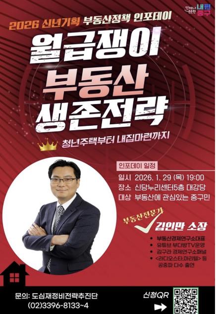 서울 중구가 급변하는 부동산 환경 속에서 주민들의 현실적인 대응 전략을 돕기 위해 오는 29일 저녁 7시 신당누리센터 5층 대강당에서 올해 첫 도시런(learn) 스쿨‘신년기획 부동산 전략 인포(INFO)데이’…