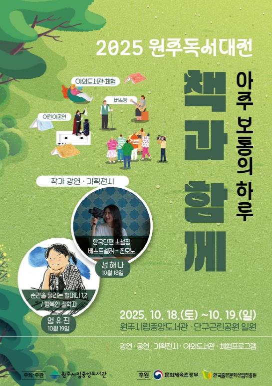 원주시는 10월 18일부터 19일까지 2일간 시립중앙도서관 일원에서 ‘2025 원주 독서대전’을 개최한다.이번 행사에서는 ‘책과 함께, 아보하!’를 주제로 강연, 공연, 기획전시, 야외도서관 등 책과 함께하…