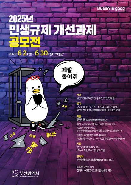 [시사월드뉴스서울, 조선아기자] 부산시는 오늘(2일)부터 6월 30일까지 6월 한 달간 시민의 눈높이에서 일상의 규제개선 과제를 발굴하고 해소하기 위해 '2025년 민생규제 개선과제 공모'를 추진한다고 밝혔다.