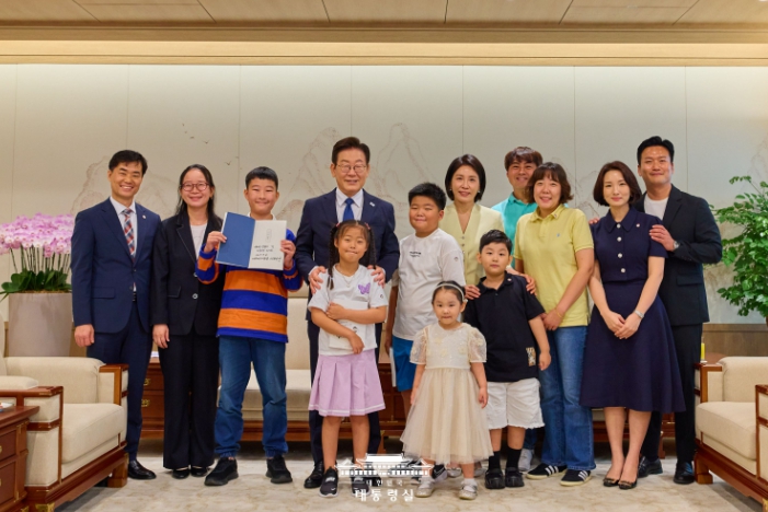 이후 아이들과 가족들은 집무실을 방문했다. 이재명 대통령과 김혜경 여사는 집무실 입구에 서서 아이들을 반갑게 맞이했다.