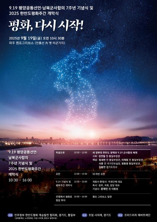 [시사월드뉴스서울, 조선아기자] 경기도와 통일부, 민주정부 한반도평화 계승발전협의회가 공동으로 주최하고 프리드리히 애버트 재단이 후원하는 ‘9.19 평양공동선언 7주년 기념행사’가 오는 19일 오전 10시 30분 파주 캠프그리브스에서 열린다.