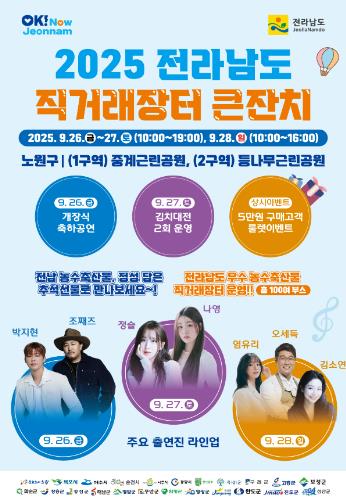 [시사월드뉴스서울, 조선아기자] 전라남도는 청정 자연에서 생산된 우수 농수축산물을 직접 선보이고, 판로를 확대하기 위해 26일부터 28일까지 3일간 서울시 노원구 중계근린공원과 등나무근린공원에서 대규모 직거래장터 큰잔치를 개장한다고 밝혔다.