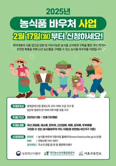 지원하려는 가구는 17일부터 주민등록 주소지 관할 동주민센터를 방문하거나, 온라인 또는 전화로 신청 가능하다. 신청을 위해서는 신분증과 농식품 바우처 사업 신청서가 필요하고, 필요시 임산부 의료기관 진단서·확인서, 외국인 가구원 증빙용 주민등록등본, 대리 신청 위임장, 위임 증명 서류 등이 추가될 수 있다.