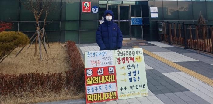 군민 A모씨는 19일 신속. 공정. 엄중한 수사를 촉구하는 1인 피켓시위를 하면서도 , 현재 " '누구'때문에 수사 진행이 잘 안되고 있는 것 같다"는 취지의 하소연까지 하였다.