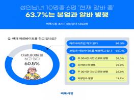 성인남녀 10명 중 6명은 현재 아르바이트를 하고 있으며, 본업과 아르바이트를 병행하는 이들도 적지 않은 것으로 조사됐다. 본업과 아르바이트를 병행하는 가장 큰 이유는 ‘부족한 본업 수입을 메꾸기 위해서’였다.