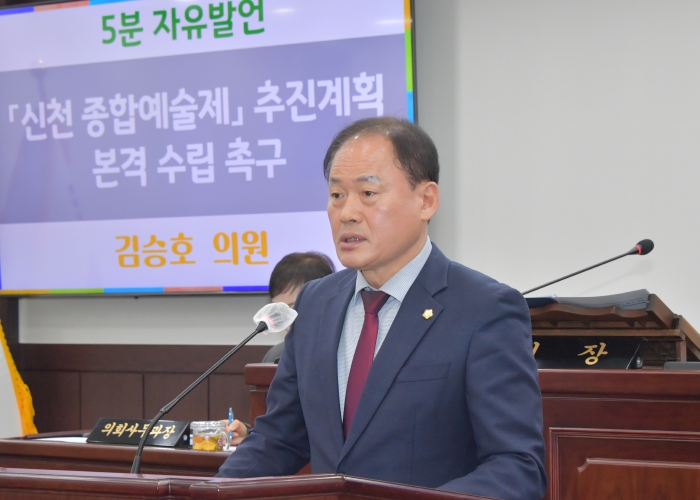 [시사월드뉴스서울, 김용식기자] 김승호 동두천시의장(국민의힘, 가선거구)이 잠시 의사봉을 내려놓고 모처럼 5분 자유발언 마이크를 잡았다. 26일 열린 제336회 동두천시의회 임시회 개회식 5분 자유발언에 나선 김 의장은 “더 늦기 전에 어서 ‘신천 종합예술제’를 본격적으로 추진해야 한다”라고 강력히 주장했다.