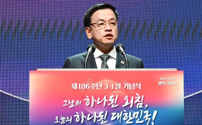 최상목 대통령 권한대행 부총리 겸 기획재정부 장관이 3월 1일 오전 서울 중구 숭의여자대학교에서 열린 '제106주년 3·1절 기념식-그날의 하나된 외침, 오늘의 하나된 대한민국!'에 참석하여 독립유공자에게 포상한 후 기념사를 하고 있다.