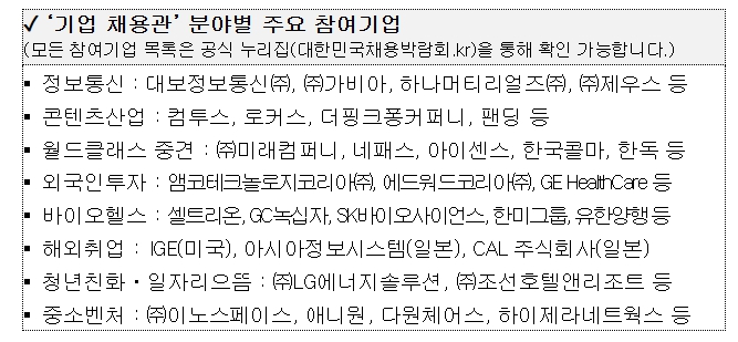 먼저 ‘기업 채용관’은 8개 분야(정보통신, 문화콘텐츠, 월드클래스 중견, 외국인투자, 바이오헬스, 해외취업, 청년친화ㆍ일자리으뜸, 중소벤처)로 구성되며 셀트리온, ㈜LG에너지솔루션, ㈜조선호텔앤리조트, 컴투스, 앰코테크놀로지코리아㈜, CAL㈜, 대보정보통신㈜, ㈜미래컴퍼니, ㈜이노스페이스 등 약 120개 기업이 참여한다.