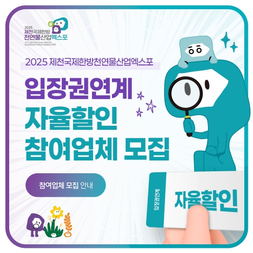 [시사월드뉴스서울, 김용식기자] 2025제천국제한방천연물산업엑스포조직위는 엑스포의 성공적인 개최와 지역경제 활성화를 위해 ‘엑스포 입장권 연계 자율할인 참여업체’를 모집한다고 밝혔다.
