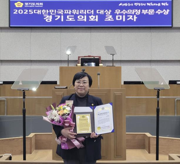[시사월드뉴스서울, 김용식기자] 조미자 경기도의원(민주, 남양주3)은 7일 한국프레스센터에서 열린 ‘2025 대한민국파워리더대상’ 시상식에서 도민을 위한 헌신적인 의정활동과 실질적인 정책 대안 제시를 통해 지방자치 발전에 기여한 공로를 인정받아 우수의정 부문 대상을 수상했다.