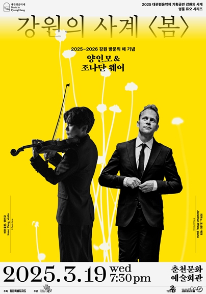 [시사월드뉴스서울, 조선아기자] 강원특별자치도는 ‘2025~2026 강원 방문의 해’를 맞아, 세계적인 바이올리니스트 양인모와 함께하는 ‘양인모 & 조나단 웨어 듀오 리사이틀’을 3월 19일 오후 7시 30분 춘천문화예술회관에서 개최한다. 본 공연은 ‘강원의 사계’라는 테마로 진행되는 첫 번째 공연으로, 봄을 맞아 클래식 음악의 아름다움을 선사할 예정이다.