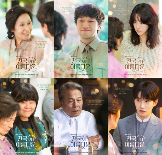 오는 4월 19일(토) 첫 방송되는 JTBC 새 토일드라마 ‘천국보다 아름다운’(연출 김석윤, 극본 이남규·김수진, 제작 스튜디오 피닉스·SLL) 측은 21일 김혜자, 손석구, 한지민, 이정은, 천호진, 류덕환의 캐릭터 포스터를 공개하며 첫 방송에 대한 기대감을 한층 더 고조시켰다.