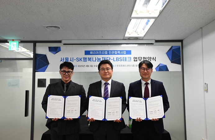 서울시는 4월 2일 14시 한국프레스센터(5층 회의실2)에서 SK행복나눔재단, LBS테크와 이동약자 정보 접근성을 높이는 무장애 지도(배리어 프리 맵) 제작을 위한 협력을 약속하는 업무협약식을 가졌다고 밝혔다. 이날 협약식에는 김철희 서울시 미래청년기획관, 이상현 SK행복나눔재단 본부장, 이시완 LBS테크 대표를 비롯해 지난해 ‘무장애 지도’ 제작 관련 아이디어를 제안한 서울청년정책네트워크 참여자 6명도 참석했다.