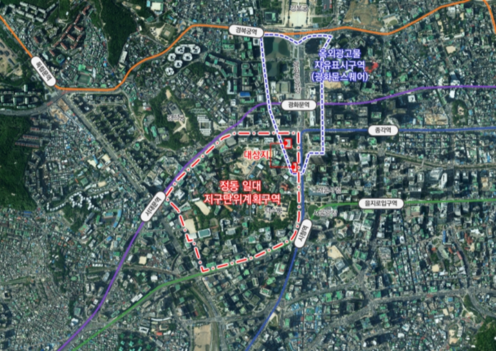 대상지는 정동 일대 지구단위계획구역 내에서 옥외광고물 자유표시구역으로 지정된 코리아나호텔과 동화면세점 건물로, 인근에 5호선 광화문역과 광화문광장, 청계천 등이 있어 유동 인구가 많고, 국내‧외 관광객이 즐겨 찾는 지역이다.