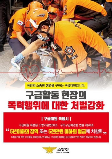 이에 소방서는 구급대원 폭행 피해 예방을 위해 다기능 조끼 및 웨어러블 캠 등 장비 확보, 폭행 피해 예방·대응을 위한 교육, 홈페이지·SNS 등에 구급대원 폭행 근절 홍보 등을 추진하고 있다.