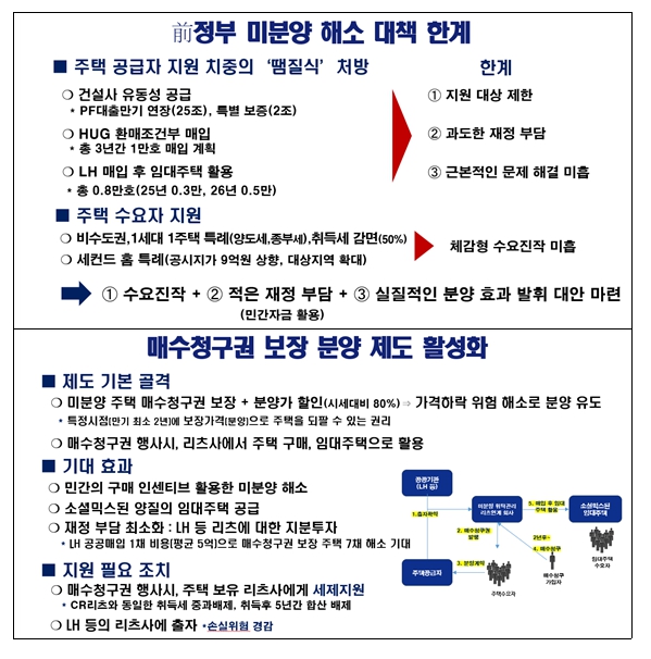 안 의원은 재정 부담은 최소화하면서도 분양 효과를 높일 수 있는 실질적 대안으로 ‘매수청구권 보장 분양제도’를 제안했다. 이 제도는 ▲미분양 주택의 분양가를 시세의 80% 수준으로 할인하고, ▲수분양자에게 매수청구권을 부여해 가격 하락 위험을 완화함으로써 민간 수요를 유인하는 방식이다.