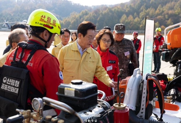 이 대통령은 먼저 강원 원주시에 위치한 산림청 산림항공본부를 찾아 산림청과 군(軍)의 산불 진화 헬기, 드론, 차량 등 핵심 장비를 점검했다.