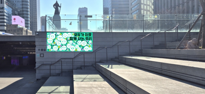 설치작품의 콘셉트는 ‘한 쌍의 이웃들, 서로 다른 밝은 표정의 얼굴들이 함께 어우러지는 국민통합을 형상화한 것’이며 광화문광장 중앙 쪽 경사로의 지하 방향 우측 계단 벽면에서 6월 말까지 4개월간 볼 수 있다.