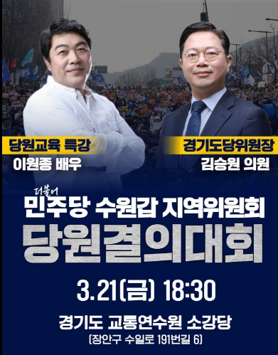 당원결의대회에는 지역위원장을 맡고있는 김승원 국회의원을 비롯해 수원갑 선출직 의원과 약 400여 명의 당원이 참석하여 결연한 의지를 다질 예정이다.